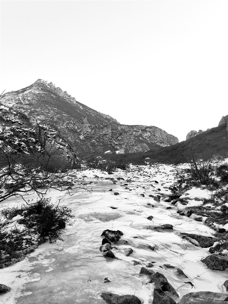 穿過公路就來到露骨山腳下,山間灌木叢生,枯葉凋零,一夜的小雪也使天空更加清澈。上山的路,總體是溯溪而上,不過腳下的小溪已經(jīng)變成冰河,但潺潺水聲不時(shí)在耳邊響起,大小石塊橫亙在冰河之上,白雪覆蓋其間,我們一行沿著前人在雪地留下的腳印,撥開齊胸的灌木枝,深一腳淺一腳、兜兜轉(zhuǎn)轉(zhuǎn)向前行。