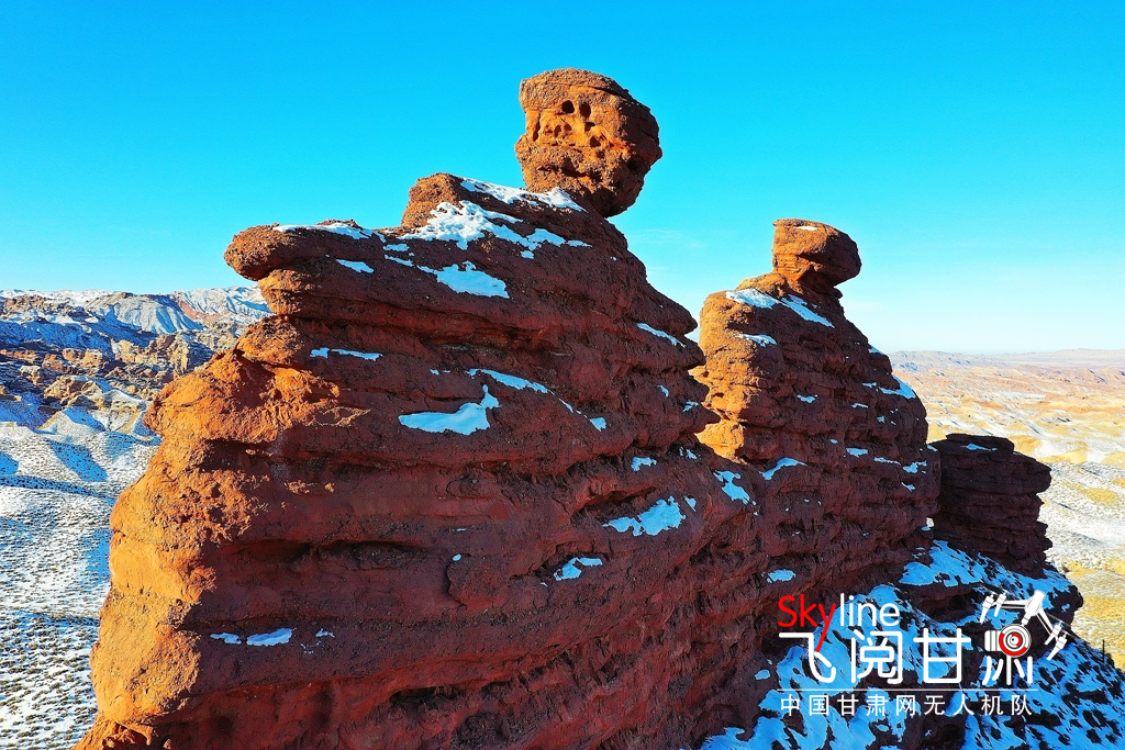 12月26日,俯瞰大雪覆蓋的甘肅省張掖平山湖大峽谷景區(qū),銀裝素裹中顯露出褐色丹霞,宛如一幅美麗畫(huà)卷,吸引眾多的游客踏雪賞景。(無(wú)人機(jī)照片)