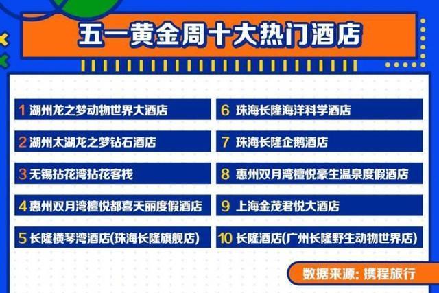 數(shù)據(jù)顯示,攜程酒店預(yù)訂間夜以及GMV在假期前三天連續(xù)突破平臺歷史峰值,對比2019年同期,單日訂單量增幅最高達(dá)70%。湖州龍之夢動物世界大酒店、湖州太湖龍之夢鉆石酒店、無錫拈花灣拈花客棧、惠州雙月灣檀悅都喜天麗度假酒店、長隆橫琴灣酒店(珠海長隆旗艦店)、珠海長隆海洋科學(xué)酒店、珠海長隆企鵝酒店、惠州雙月灣檀悅豪生溫泉度假酒店、上海金茂君悅大酒店、長隆酒店(廣州長隆野生動物世界店)為今年“五一”黃金周熱門酒店TOP10。