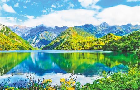 湖邊骨麻山巍峨聳立,湖水清澈澄碧,周圍森林茂密,草甸如茵。夏季漫山遍野的高山杜鵑競(jìng)相怒放,形成高山、湖泊、森林、花海交織的美麗畫卷。
