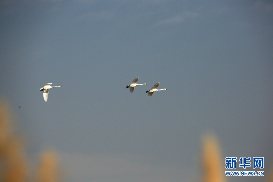 冬日清晨的甘肅省張掖國家濕地公園里碧波蕩漾,成群的白天鵝、黑天鵝等鳥類聚在一起游弋嬉戲,歡騰跳躍,成為一道亮麗的風(fēng)景線,吸引眾多游客觀賞拍照。新華網(wǎng)發(fā)(陳禮 攝)