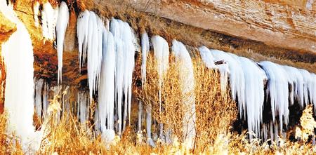 小路隨著山勢(shì),曲折延伸。對(duì)面荒坡上隨處可見大大小小的洞穴,不知是經(jīng)年風(fēng)蝕,還是人工開采沙子所致。洞穴四周,散落著小小的冰瀑,有的似乎只有盈盈一握。長長短短的冰掛,一綹一綹,一排一排,遠(yuǎn)遠(yuǎn)近近錯(cuò)落有致地覆在山坳里,垂在砂石間,掛在懸崖上。一些細(xì)細(xì)長長的冰溜,像極了臘月里母親剛出鍋的粉條。搭在院子竹竿上的一掛粉條,下邊還垂著水珠,上邊早已凍成了細(xì)細(xì)的冰棒,而滴落在地上的水已凝成了冰堆。