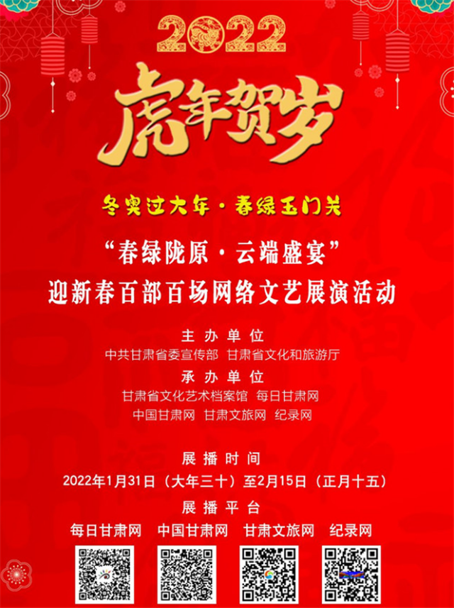 甘肅省博物館在春節(jié)期間舉辦了“虎虎生福——壬寅(虎年)新春生肖文物聯(lián)展”,甘肅省圖書館舉辦7大專題30余項文化體驗活動。在“春之華章”2022年甘肅省電視春節(jié)聯(lián)歡晚會上,原創(chuàng)話劇《八步沙》、隴劇《大禹治水》等精彩上演;甘肅省非遺保護中心開展了“虎虎有神過大年——如意甘肅·多彩非遺”宣傳推廣活動;甘肅演藝集團通過線上線下結合方式,開展2022“我們的中國夢”——文化進萬家迎新春文藝演出活動;張掖市舉辦春節(jié)“九曲黃河燈陣啟燈納福非遺文化展演”活動。
