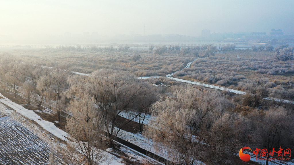 張掖市高臺(tái)縣黑河國(guó)家城市濕地公園的霧凇景觀(guān)。