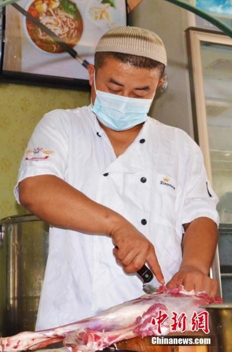 資料圖為8月12日,蘭州主城區(qū)某手抓羊肉招牌老店內(nèi),店員正在切新鮮的東鄉(xiāng)羔羊肉。 中新社記者 李亞龍 攝