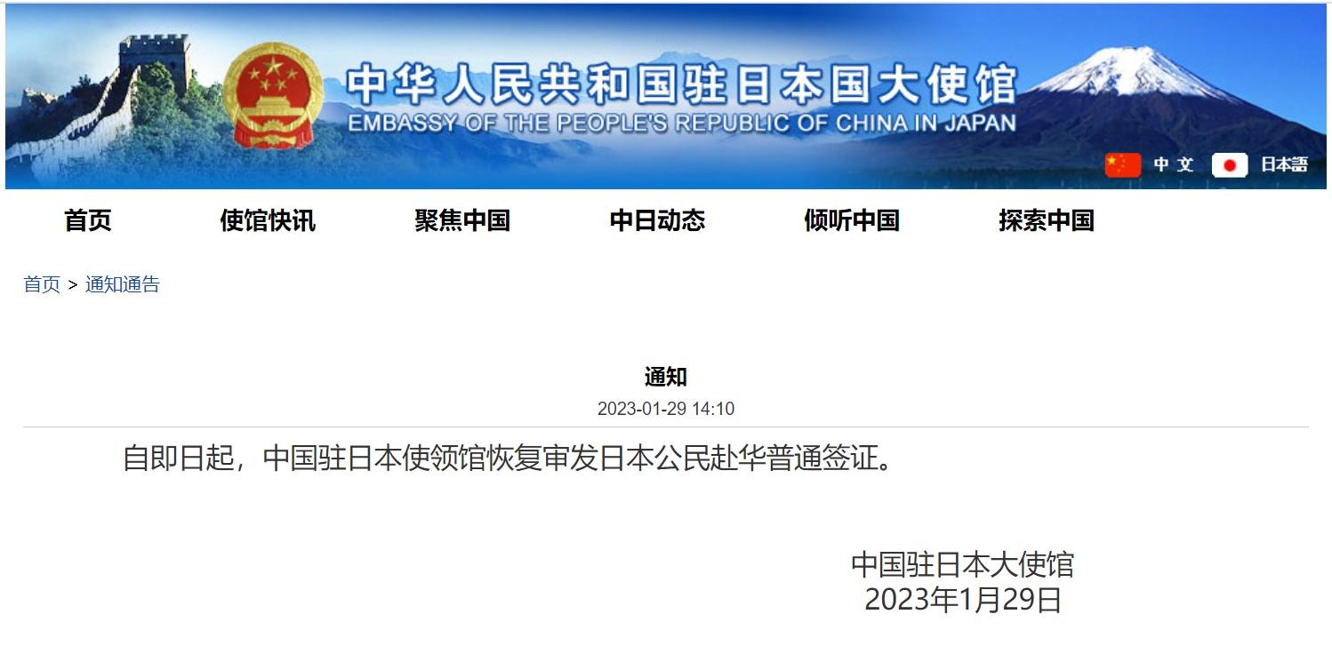 中國駐日本使領(lǐng)館1月29日宣布:自即日起,中國駐日本使領(lǐng)館恢復審發(fā)日本公民赴華普通簽證。