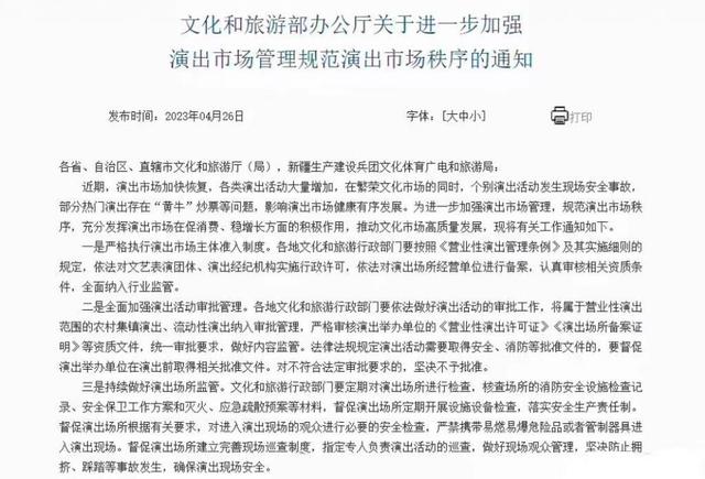 近日,文旅部辦公廳發(fā)布《文化和旅游部辦公廳關(guān)于進(jìn)一步加強(qiáng)演出市場(chǎng)管理規(guī)范演出市場(chǎng)秩序的通知》。通知提到,對(duì)臨時(shí)搭建舞臺(tái)、看臺(tái)的演唱會(huì)、音樂(lè)節(jié)等大型演出活動(dòng),文化和旅游行政部門(mén)要做好演出現(xiàn)場(chǎng)監(jiān)管,查驗(yàn)演出舉辦單位的演出批準(zhǔn)文件及相關(guān)手續(xù),核驗(yàn)演員信息及演出節(jié)目?jī)?nèi)容,嚴(yán)禁擅自變更演員及演出內(nèi)容,嚴(yán)禁假唱、假演奏等違法違規(guī)行為。
