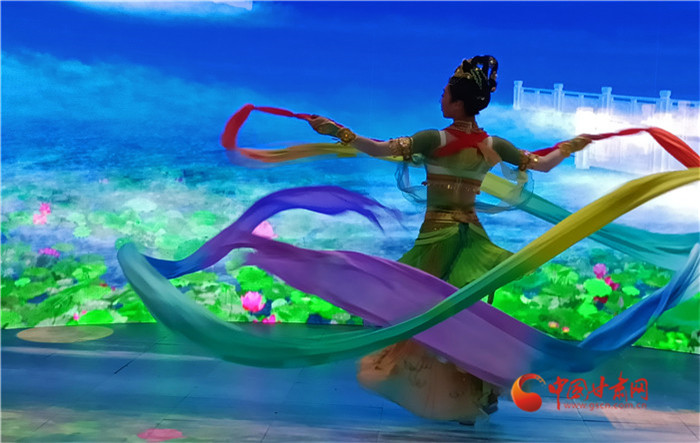 如意甘肅館選擇“以鹿王本生圖”中的綠色作為設計的主色調,將敦煌元素鑲嵌在展館各個角落。特別是門口的展演舞臺,經(jīng)典舞劇《絲路花雨》展演的反彈琵琶、敦煌伎樂天等將觀眾帶入了有聲有色的敦煌,成為如意甘肅館的一大吸睛之處。