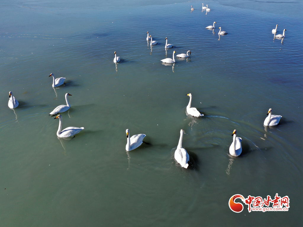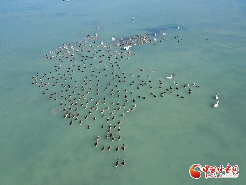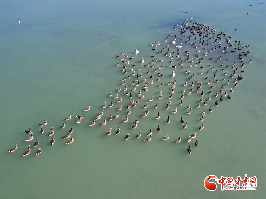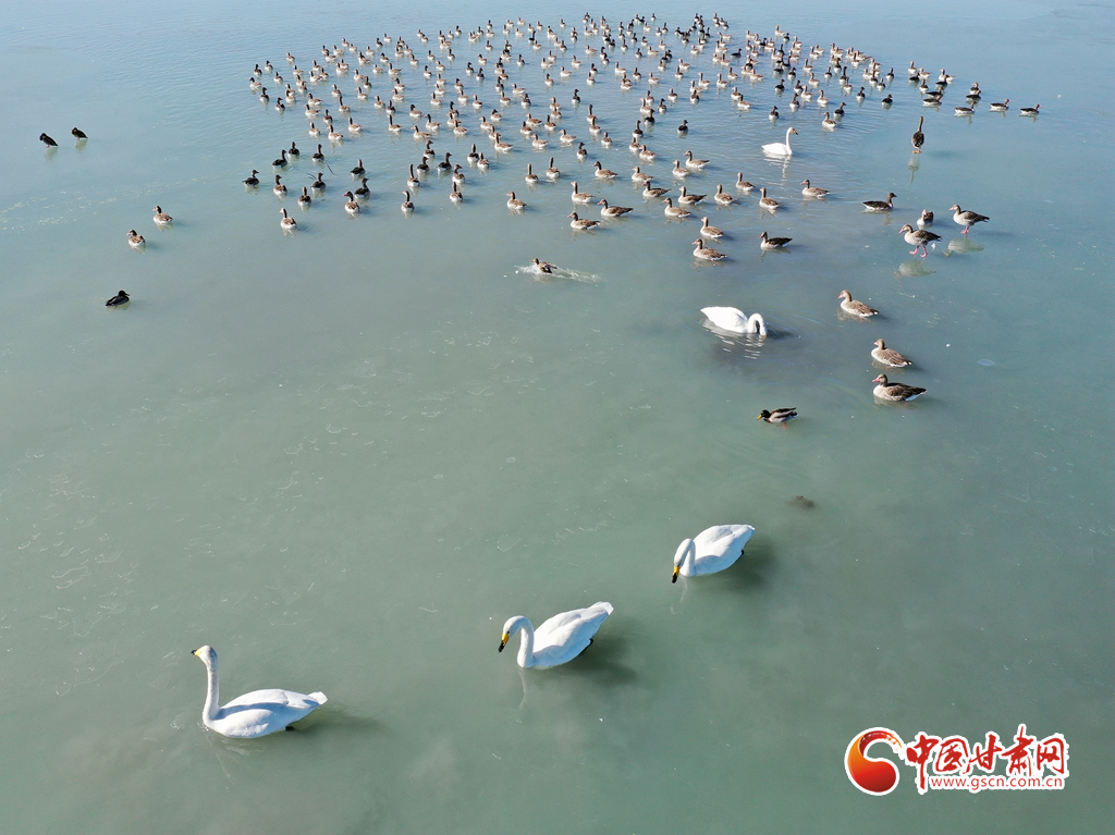 11月18日,在甘肅省張掖市臨澤縣新華農(nóng)場(chǎng)湖面上,眾多天鵝、灰雁和綠頭鴨等候鳥(niǎo)在此越冬棲息。