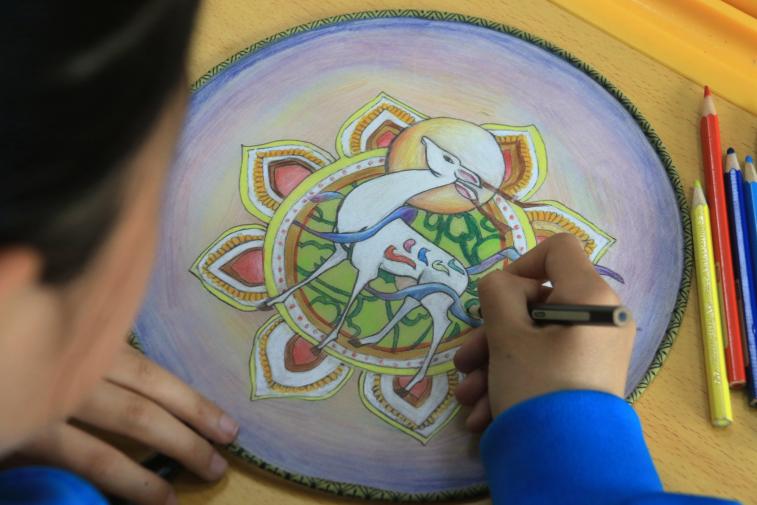 敦煌市西關(guān)小學(xué)美術(shù)社團的學(xué)生正在為帶有敦煌壁畫元素的團扇畫圖上色。張曉亮 攝