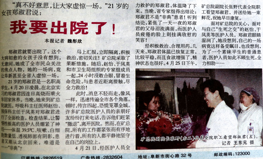 作為部門領(lǐng)導(dǎo),她依然表現(xiàn)出色,2003年“非典”期間,她擔(dān)任阜新晚報要聞部主任,她提出“最危險的地方,我先上!”4月20日,有一個學(xué)生從北京回來,因為高燒不退被懷疑為感染“非典”,一時間謠言四起,恐慌籠罩全城,魏彤欣一個人冒著風(fēng)險深入醫(yī)院跟蹤采訪,在得知確診不是“非典”后,第一時間發(fā)出了報道《我要出院了》,及時消除了公眾恐慌情緒。她帶領(lǐng)記者深入發(fā)熱門診、城市出入口的檢查站和醫(yī)護(hù)人員之間,掌握了大量的一手材料,共采寫了70余篇稿件,她本人被評為“遼寧省抗擊非典新聞宣傳先進(jìn)個人”,她所在的部門被評為“遼寧省抗擊非典新聞宣傳先進(jìn)集體”。