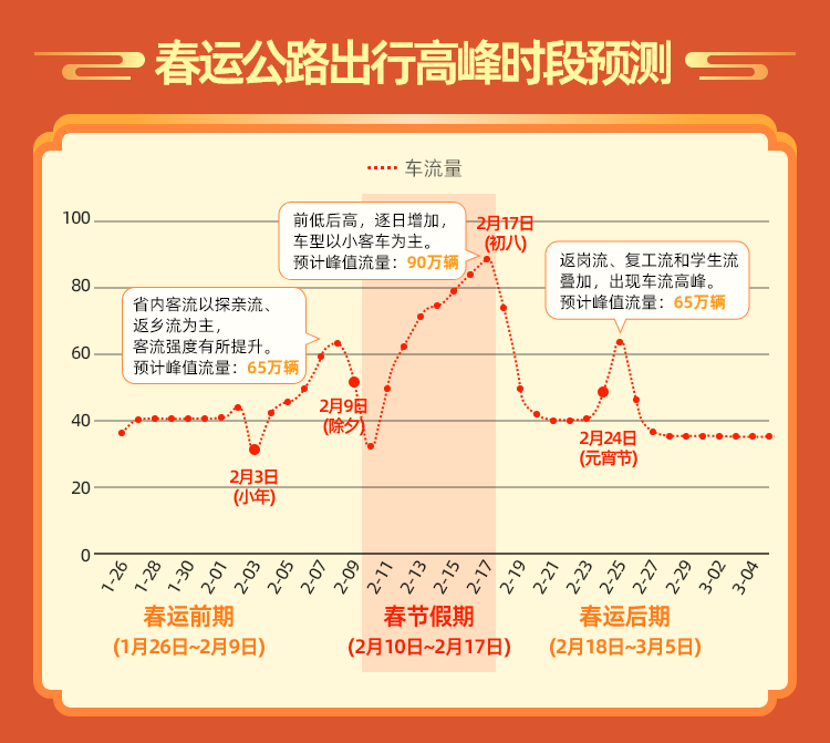 春節(jié)假期(2月10日至2月17日):預(yù)計(jì)2月10日(正月初一)車流將明顯回落,從2月11日至13日(正月初二至正月初四)拜年聚會(huì)、短途自駕出行車流較集中,出現(xiàn)短途出行小流量;2月17日假期最后一天(正月初八)出現(xiàn)返程高峰,13點(diǎn)至17點(diǎn)環(huán)蘭路網(wǎng)部分路段將出現(xiàn)區(qū)域性擁堵。