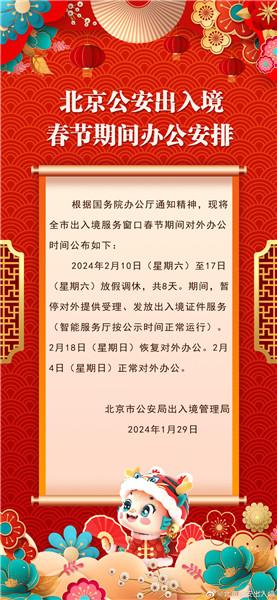 據(jù)北京市公安局出入境管理局官方微博消息,北京市公安局出入境管理局發(fā)布春節(jié)期間辦公安排:北京市出入境服務(wù)窗口2月10日至17日(大年初一至初八)放假調(diào)休,共8天。期間,暫停對外提供受理、發(fā)放出入境證件服務(wù)(智能服務(wù)廳按公示時(shí)間正常運(yùn)行)。