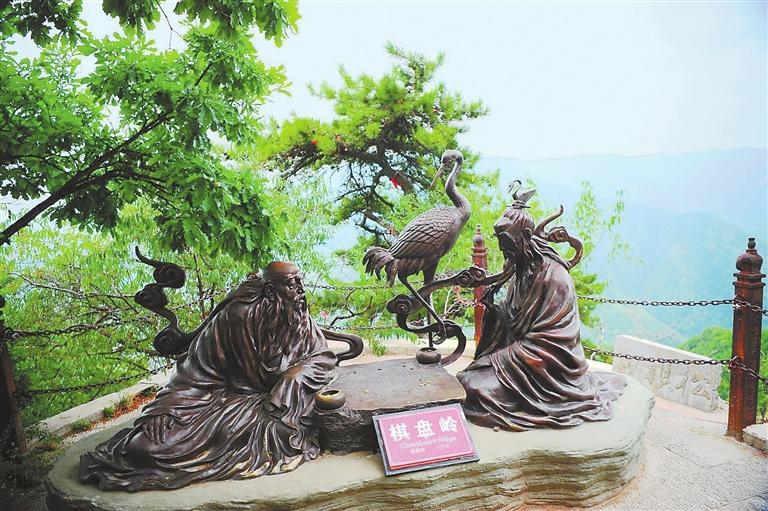 再沿左側經(jīng)過四海龍君殿,往前走少許路程,便到九天圣母殿,殿旁還保留著一塊古樸的青石棋盤,旁邊有一株傘形古松彎身而立,人們稱其為“觀棋松”,傳說此地便是廣成子和赤松子經(jīng)常下棋的地方。