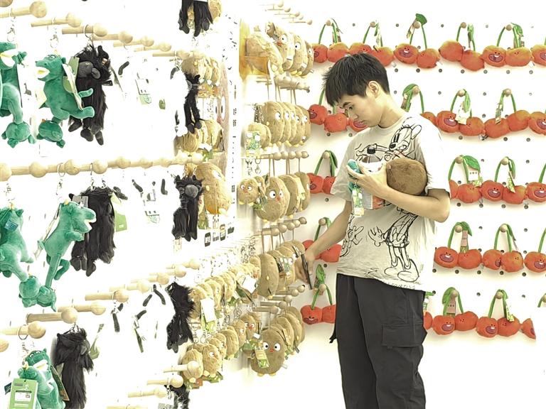 7月17日上午11時(shí),藝術(shù)生活館內(nèi),來自西安的大學(xué)生小朱入手兩個(gè)綠馬、一個(gè)甘肅麻辣燙毛絨玩具、兩盒禮品包裝三炮臺(tái)。“送家人,送同學(xué),都很好。我感覺這兒越逛越好玩,不虛此行。”小朱說。