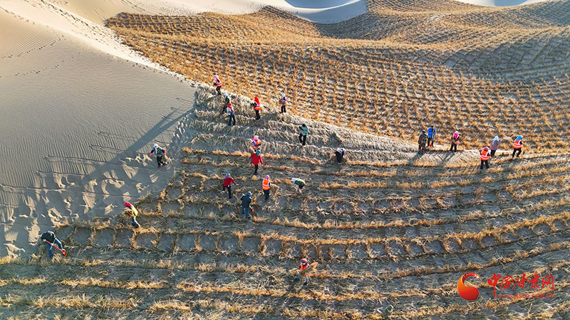 據(jù)了解,金塔縣黑河中游防沙治沙林草綜合治理項目,今年計劃給1174畝沙漠戴上草方格“圍脖”,工期50天,預計需要稻草410噸。隨著治沙進度的加快,一個個草方格沙障從無到有漸次鋪開,猶如一條條金色的“鎖鏈”,牢牢鎖住沙丘,在茫茫沙海筑起了一道道生態(tài)安全屏障。當下正值農(nóng)閑時節(jié),該項目通過“以工代賑”,改變了傳統(tǒng)做法,通過有償勞動讓群眾由治沙的“看客”變?yōu)橹紊车?ldquo;主角”,構建起全民參與防沙治沙新格局,實現(xiàn)治沙致富雙贏,預計增加群眾收入3000余萬元。