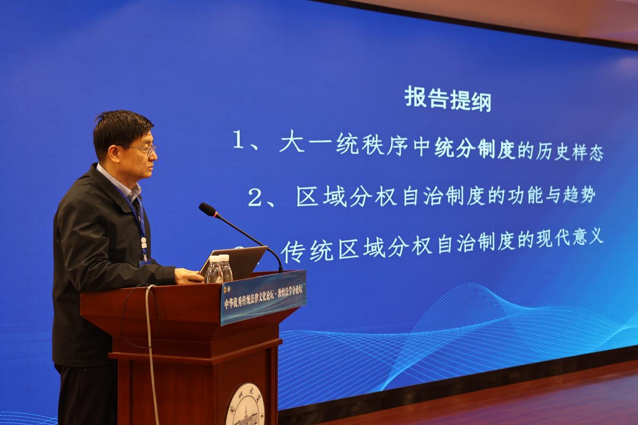 中國(guó)社會(huì)科學(xué)院法學(xué)研究所二級(jí)研究員、博士生導(dǎo)師、法制史研究室主任、中國(guó)法律史學(xué)會(huì)會(huì)長(zhǎng)、第七屆“全國(guó)十大杰出青年法學(xué)家”張生,從大一統(tǒng)秩序中統(tǒng)分制度的歷史樣態(tài)、區(qū)域分權(quán)自治制度的功能與趨勢(shì)、傳統(tǒng)區(qū)域分權(quán)自治制度的現(xiàn)代意義等方面作了題為“大一統(tǒng)秩序下的統(tǒng)分制度及其現(xiàn)代意義”的主旨報(bào)告。