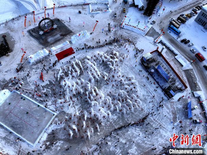 當(dāng)日,北極村七星廣場(chǎng)上,身披紅斗篷、頭戴紅帽子的游客和當(dāng)?shù)鼐用窠M成一個(gè)巨大的“53°”造型。伴隨著激情澎湃的音樂(lè),他們擺好姿勢(shì),將手中熱水奮力一灑,齊聲高喊“極致興安嶺 潑出好風(fēng)景”,一道道劃破天際的弧線,碰撞出的神奇光影。震撼的場(chǎng)面讓現(xiàn)場(chǎng)游客驚呼不已,他們紛紛舉起手機(jī)定格這個(gè)精彩瞬間。