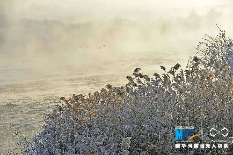 寒冬里,日出時(shí)分,這里霞光綻放,萬(wàn)物蘇醒,兩岸的霧凇冰清玉潔,上演晨間浪漫。