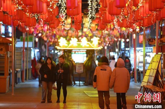 1月13日晚,甘肅敦煌夜市內,游人感受新春燈飾。據(jù)了解,從2024年12月1日至2025年2月28日,當?shù)伉Q沙山月牙泉、玉門關、敦煌雅丹世界地質公園等景區(qū)對國內外所有游客免門票,莫高窟門票實行半價優(yōu)惠,開放洞窟由8個增加至10個,為游客提供了更為豐富的觀賞內容。中新社記者 李亞龍 攝
