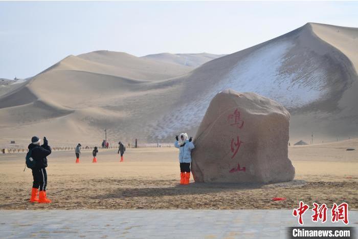 1月13日,甘肅敦煌鳴沙山月牙泉景區(qū)內,游人免票游玩。中新社記者 李亞龍 攝