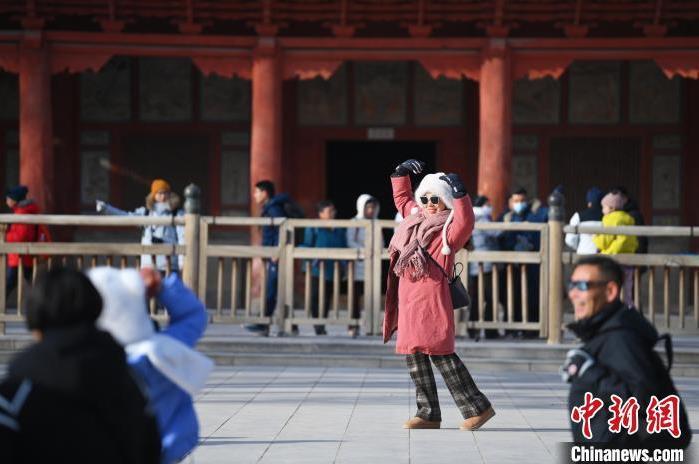 1月13日,甘肅敦煌莫高窟景區(qū)內,游人在莫高窟標志性建筑九層樓前拍照打卡。中新社記者 李亞龍 攝