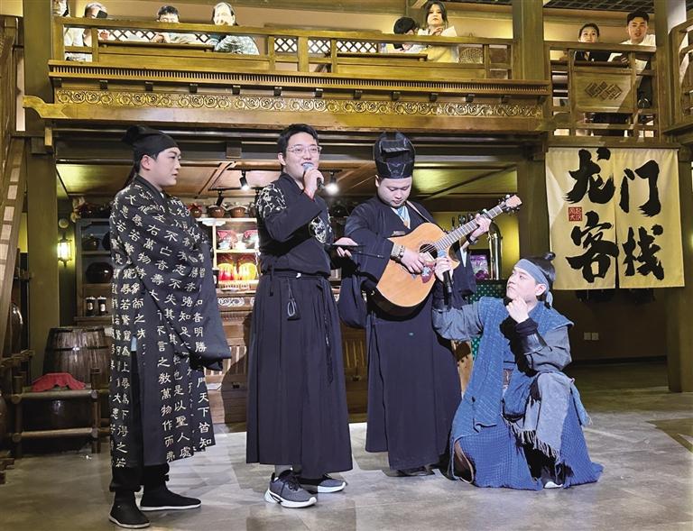 “諸位小友近來可好?”“好!”在街區(qū),NPC們與游客的互動(dòng)成為一大亮點(diǎn)。為了讓游客更好地沉浸其中,街區(qū)里的“蘭裳閣”專門提供服裝出租和妝造設(shè)計(jì)服務(wù)。游客們在這里換上漢服、做好造型,“穿越”成古人與NPC們共同沉浸在這場歷史旅行中。張偉彥在“龍門客棧”工作快半年了,飾演店小二馬一刀。他對角色有著自己的理解:“導(dǎo)演讓我演店小二,大家印象里店小二都是機(jī)靈、腿腳快的。但我演的這個(gè)店小二帶著江湖氣息,他藏在龍門客棧,其實(shí)是個(gè)刀客,在這里打工是為了打探消息,畢竟龍門客??墒墙⒌木奂?。”記者走在街區(qū),時(shí)不時(shí)就能看到他拿著草帽,熱情地招呼游客玩接帽子游戲。遇到靦腆不敢嘗試的游客,他也會不斷鼓勵(lì),有時(shí)候碰上外國游客,他還隨口說幾句英語與其互動(dòng)。