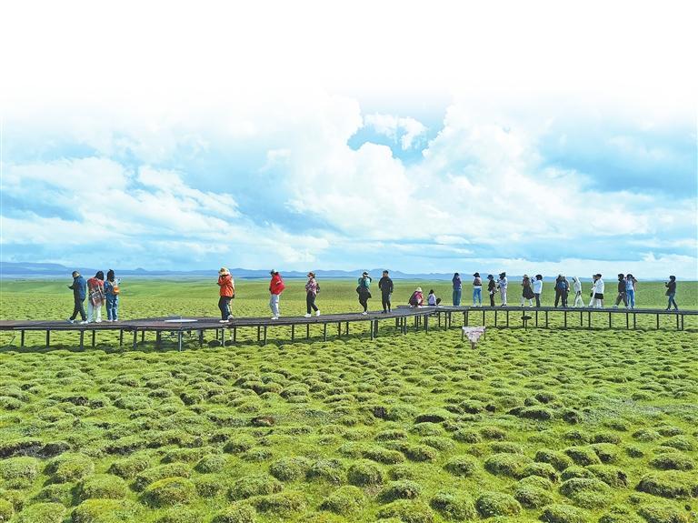 甘津文旅資源對接考察團(tuán)成員在甘南天池冶海北岸拍照。