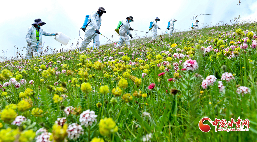 盛夏時(shí)節(jié),位于張掖市肅南裕固族自治縣的皇城夏日塔拉草原、康樂(lè)賽汗塔拉草原,宛如一塊巨大的綠色絨毯鋪向天際,滿目翠綠,令人心醉神迷。然而,此時(shí)也正是草原上狼毒花毒害草盛放、蝗蟲(chóng)繁殖的高峰期。連日來(lái),肅南縣林草專(zhuān)業(yè)技術(shù)人員帶領(lǐng)2000多牧民,抓住毒害草開(kāi)花、蝗蟲(chóng)繁殖最快,也是清除滅殺的最佳時(shí)機(jī),在“三北”工程六期160多萬(wàn)畝廣袤的草原上,打響了以“蟲(chóng)害防治+害草治理+噴施葉面+播撒草籽的”為核心的“三北”工程林草濕荒一體化保護(hù)修復(fù)攻堅(jiān)戰(zhàn)。