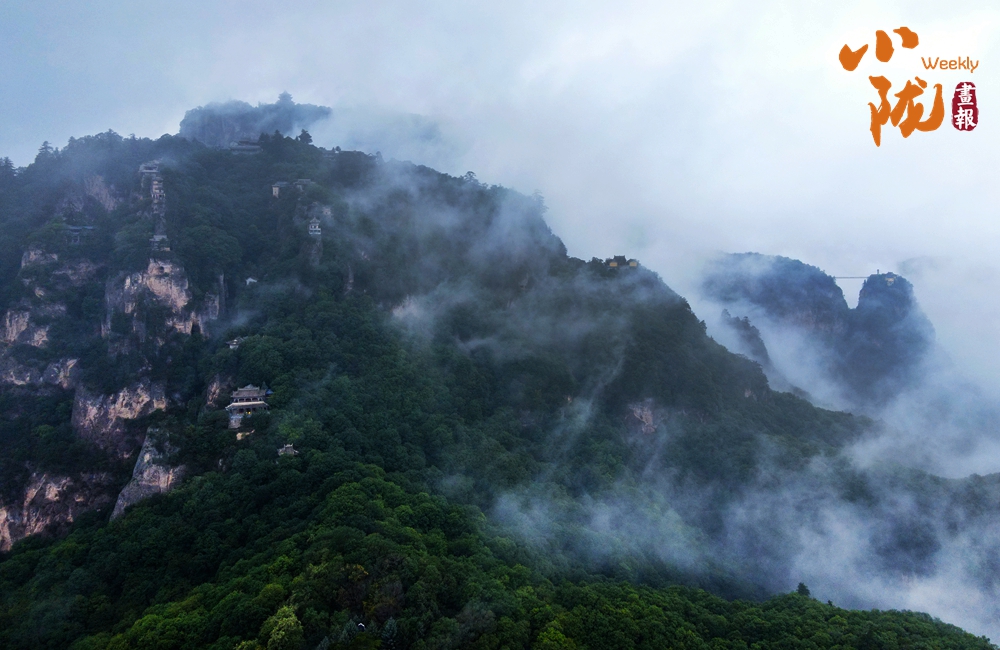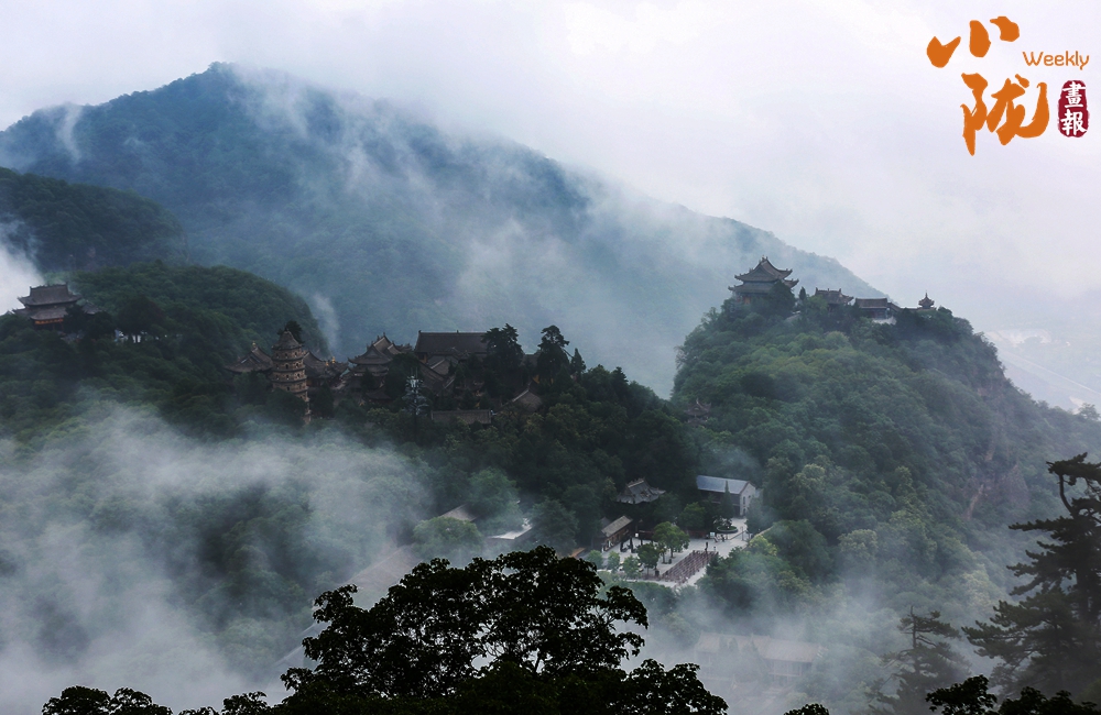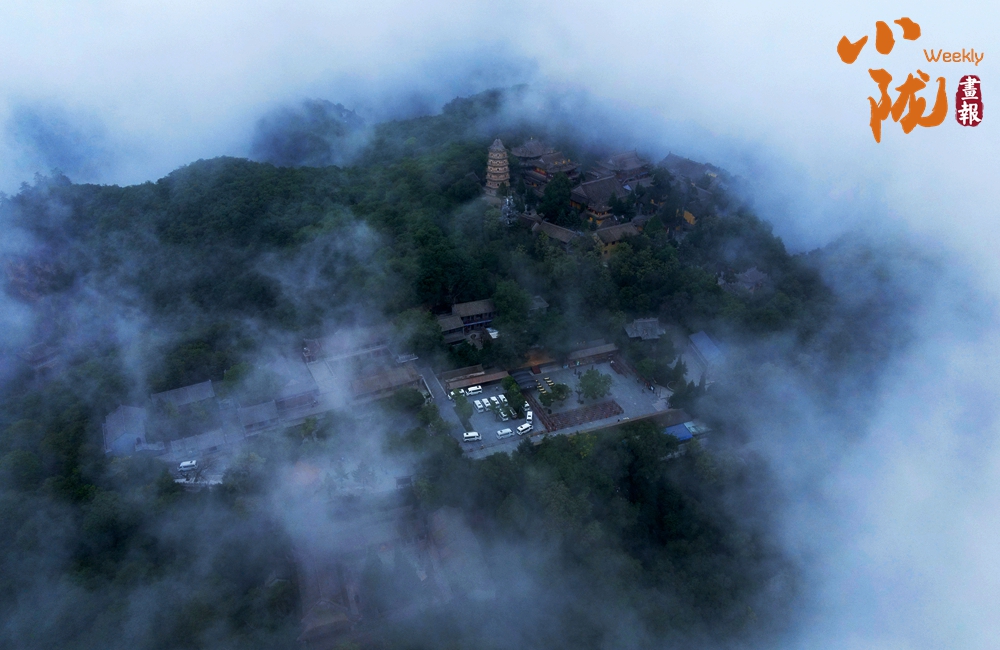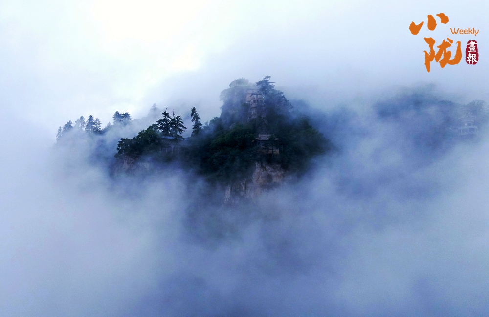 云霧繚繞,山水與寺廟隱現(xiàn),營(yíng)造出神秘且令人向往的視覺(jué)效果。站在半山腰,背靠懸崖,深邃不可見(jiàn)底,不禁生出“山登絕頂我為峰”的豪情。然而,世間萬(wàn)物,瞬息萬(wàn)變,是否成為峰巔之巔又何妨?