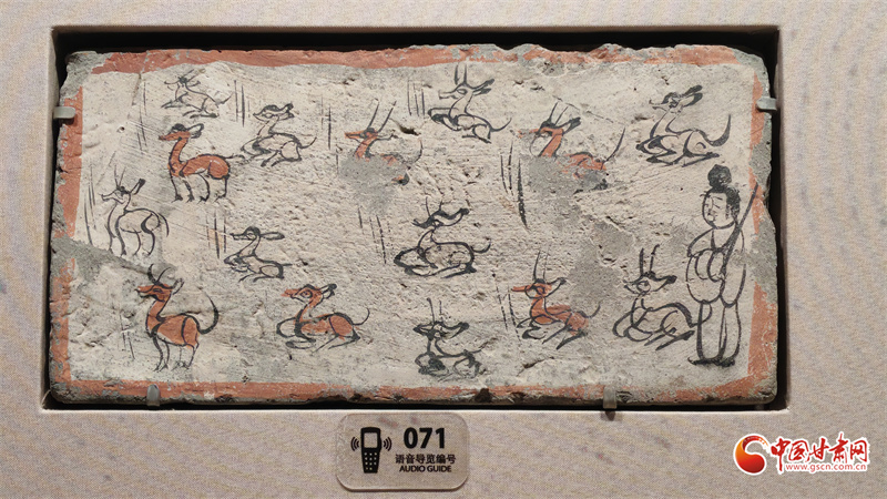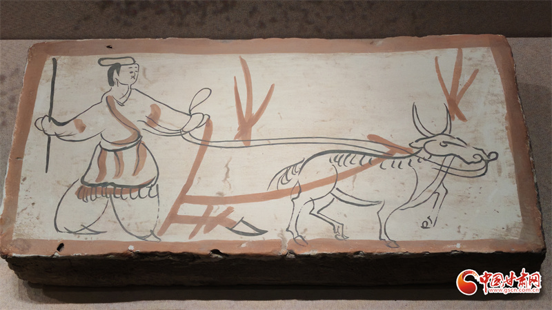 在博物館的“古冢丹青——高臺魏晉十六國時期墓葬壁畫藝術陳列”展廳里,記者看到,《二牛耕地畫像磚》生動再現(xiàn)了當時的農耕技術:兩頭耕牛架著直轅犁,后隨的男子一手扶犁一手揚鞭,展現(xiàn)了典型的“二牛抬杠”耕作方式?!赌谅箞D壁畫磚》則描繪了古人放牧鹿群的獨特場景,為研究當時的畜牧業(yè)發(fā)展提供了珍貴資料。
