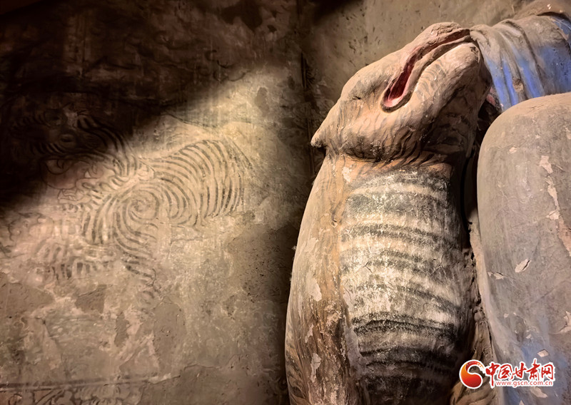 為何要將老虎塑造得如此乖巧?答案就在老虎旁邊的壁畫中。壁畫里的老虎張牙舞爪、張著大嘴,盡顯兇猛之態(tài)。而羅漢手中的老虎卻溫順如貓,這一鮮明對(duì)比,恰恰生動(dòng)地說明了羅漢已將老虎降服。