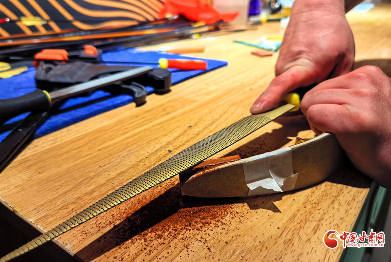 2011年,還是大學(xué)生的謝建戈在百度貼吧結(jié)識(shí)了山東臨沂“高氏傳統(tǒng)弓箭”非遺傳承人高超。囊中羞澀的他提出“先貨后款”,高超被這份赤誠(chéng)打動(dòng),寄來(lái)第一套玻片弓料。一個(gè)月后,生活費(fèi)一到賬,他第一時(shí)間把錢(qián)打了過(guò)去——網(wǎng)絡(luò)那端的高超從此記住了這個(gè)甘肅小伙。2012年,他做出人生第一把玻片弓。