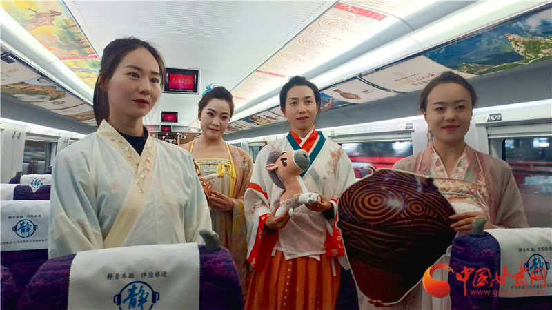 這趟列車(chē),是敦煌研究院、甘肅省博物館、甘肅簡(jiǎn)牘博物館、蘭州市博物館、天水市博物館、武威市博物館、平?jīng)鍪胁┪镳^、臨夏州彩陶館(州博物館)、和政古動(dòng)物化石博物館九家國(guó)家一級(jí)博物館聯(lián)袂打造的“高鐵流動(dòng)博物館”。