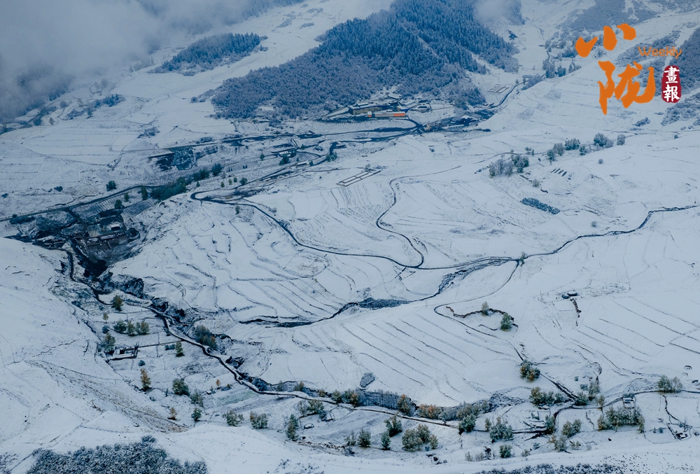 阡陌縱橫的農(nóng)田披上了素白的紗衣,天地之間,仿佛只剩下黑白兩種顏色,那遠(yuǎn)山的輪廓,那梯田的線條,那河床的蜿蜒,構(gòu)成了最純正的中國水墨畫。